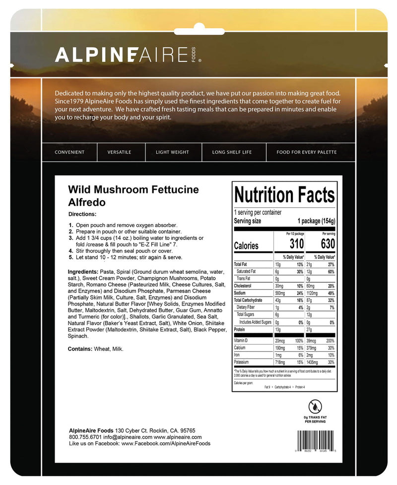 Discover the exquisite taste of Alpine Aire Wild Mushroom Fettuccine Alfredo, a gourmet ready-to-eat meal perfect for outdoor adventures, camping trips, and busy days on the trail. Crafted with premium, high-quality ingredients, this delicious dish combines tender fettuccine pasta with a rich and creamy Alfredo sauce infused with wild mushrooms for an earthy, savory flavor. Made from durable, boil-in-bag packaging, it ensures quick and easy preparation-just heat and enjoy-making it ideal for outdoor enthusiasts and backpackers seeking convenient, gourmet dining options.This alpine-inspired pasta meal features a meticulous blend of natural, sustainably sourced ingredients, including premium wild mushrooms and authentic Parmesan cheese, delivering exceptional taste and authentic regional fla ...