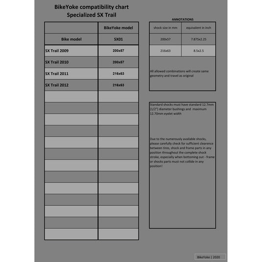 Upgrade your Specialized SX Trail 2009-2012 with the Bike Yoke Yoke SX01, the essential shock conversion kit designed for optimal performance and versatility. Crafted with precision engineering and high-quality materials, the Yoke SX01 enables you to use a standard shock on your existing frame, enhancing ride quality and customization options.Materials & ConstructionManufactured from durable, lightweight aluminum alloys, the Bike Yoke Yoke SX01 offers superior strength and corrosion resistance. Its precise machining ensures a perfect fit, minimizing play and maximizing shock stability under demanding trail conditions.Performance & EngineeringEngineered for seamless compatibility, the Yoke SX01 supports shock sizes of 200x57mm (for 2009/2010 models) and 216x63mm (for 2011-2012 model ...